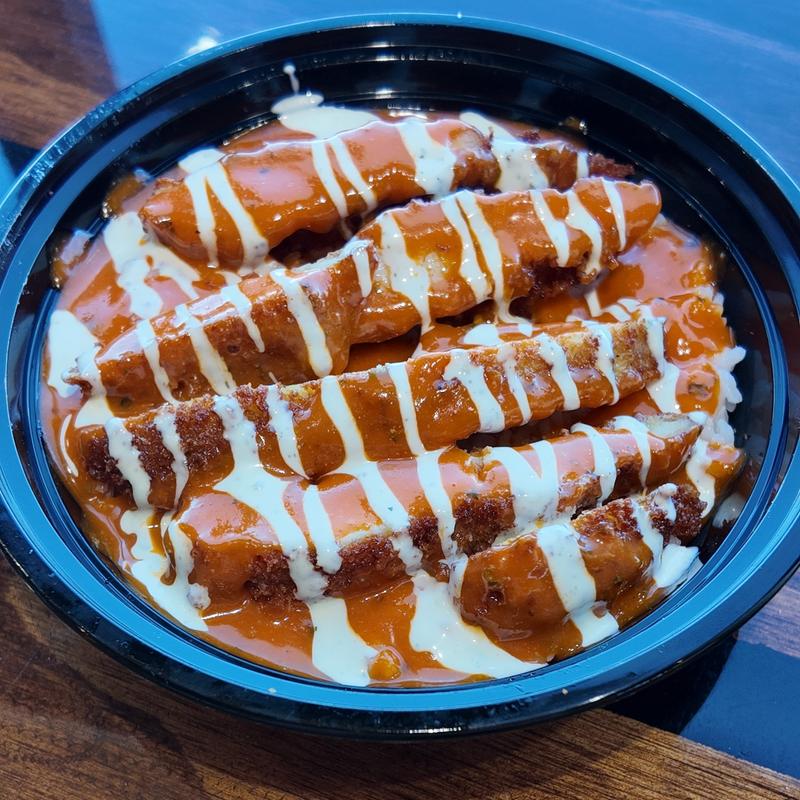 French fries, ranch, Kilauea sauce (buffalo), cabbage, and Chicken Katsu