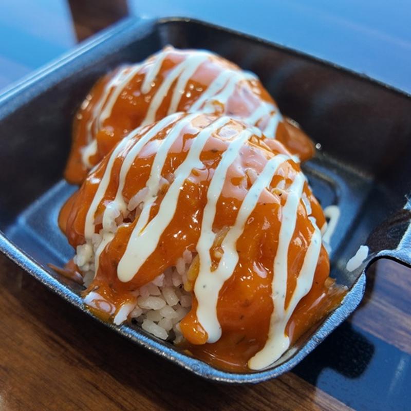 Buffalo style sandwich; chicken katsu (breaded), cabbage, ranch, and Kilauea sauce (buffalo). Served with a side of rice and house sauce (teriyaki)